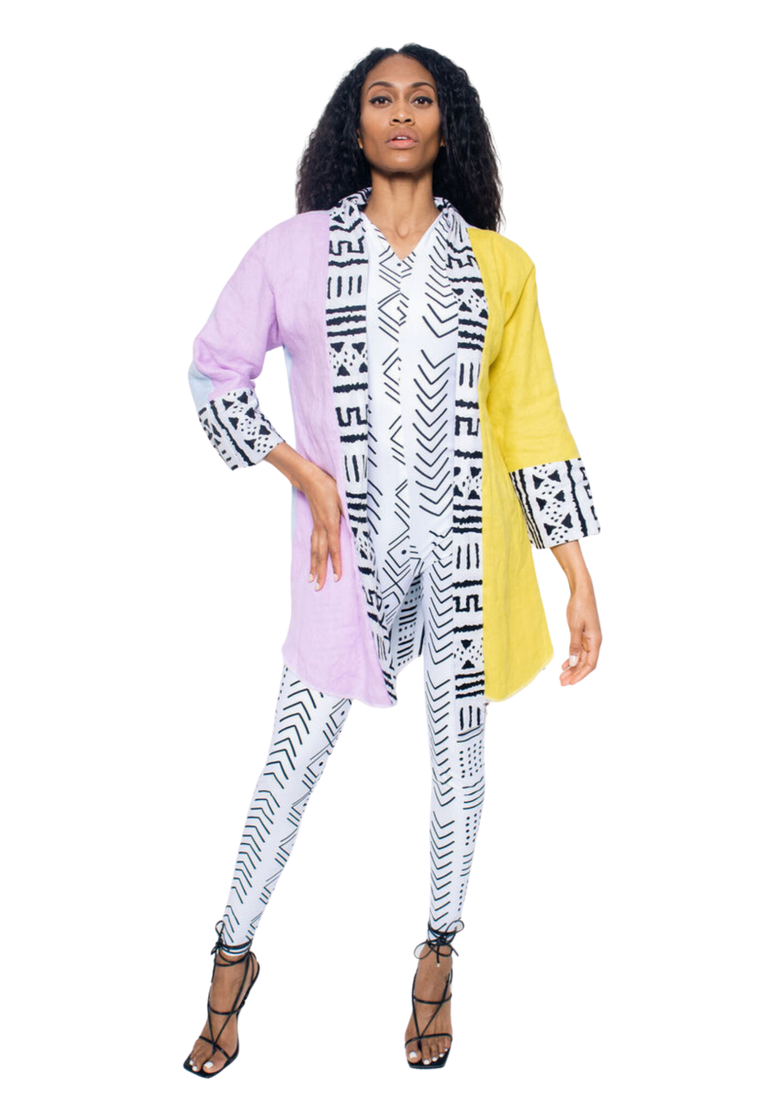 One side features an allover black and white graphic mudcloth print, while the other side features a color block trio of our feature pastel colors for the season - lilac, coastal blue and pineapple yellow with mudcloth print lapel and cuffs for a fun, playful look.